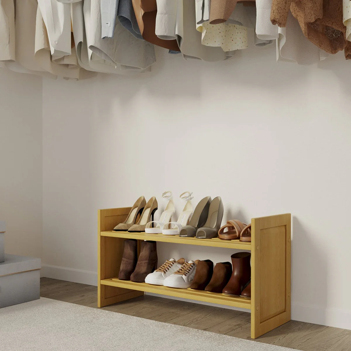 - The Shoe Closet: Holds 6–8 pairs of shoes (tested up to Men's size 12) with a flat surface that won't mark heels like wire racks.